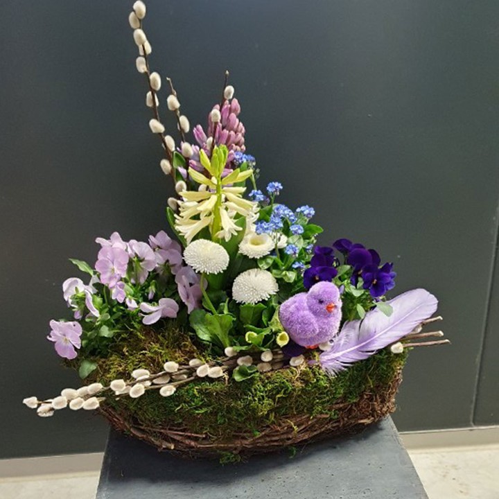 Mooskörbchen mit blau-lila Tönen gepflanzt und geschmückt. kombiniert.