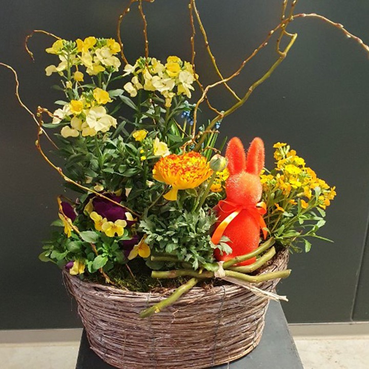 Gepflanzter Frühlingskorb mit einem bunten Hasen dekoriert. (Farben können hier Variieren.)