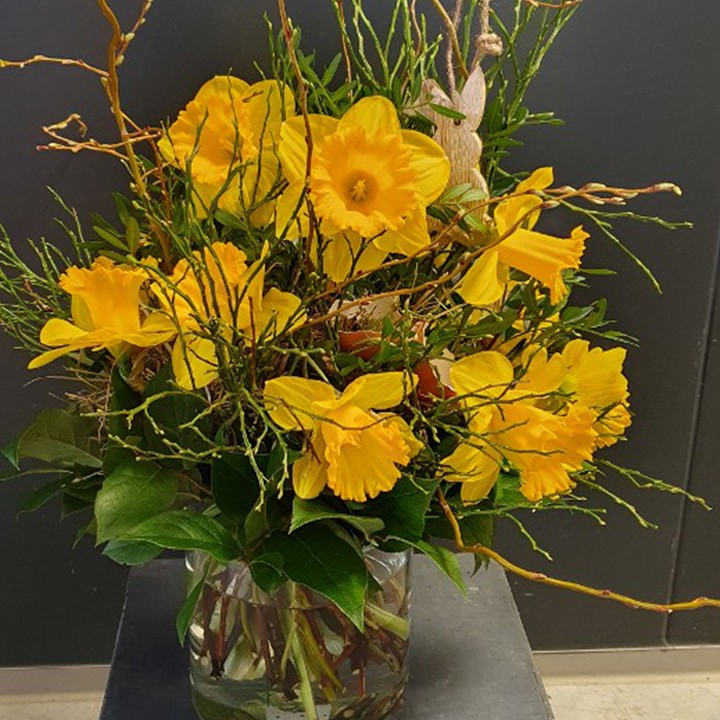 Strauß mit Narzissen, Hase, Eiern und Frühjahrszweigen.