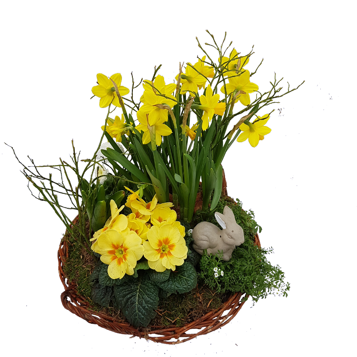 Mit kleinen Osterglocken, Primel, Bellis, Hyazinthe und Hase im Prizelagonest.