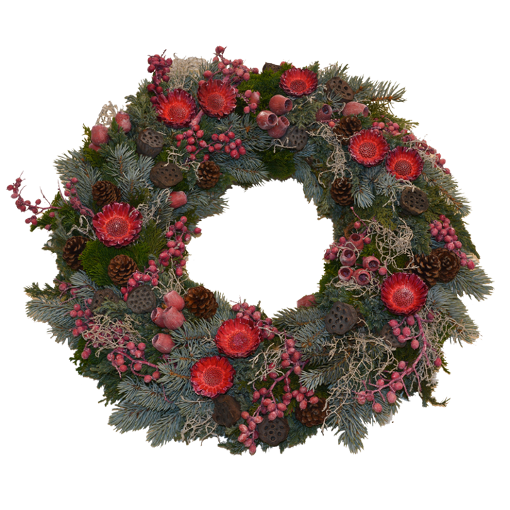 Blaufichte- und Koniferenkranz in Rottönen gehalten.