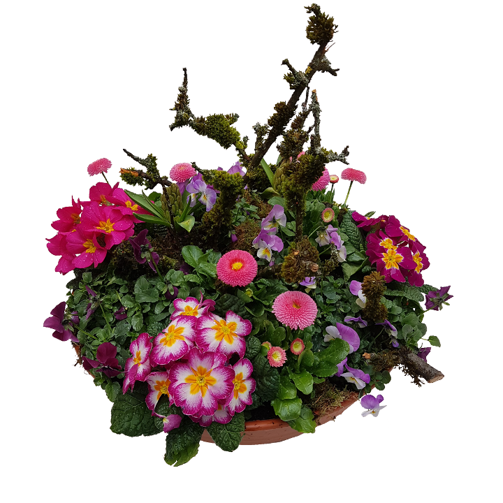 Schale in Rosa mit Frühjahrsblühern gepflanzt. Hyazinthen, Primel, Gänseblümchen, Hornveilchen und bemoosten Zweigen kombiniert.