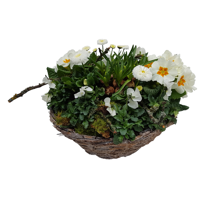 Korb mit weißen Frühjahrsblühern wie z.B. Primel und Hornveilchen und Zweigen.