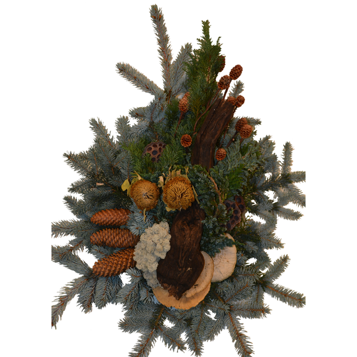 Liegendes Blaufichtengesteck mit Wurzelholz und Protea, Moosen in Naturfarben gearbeitet.